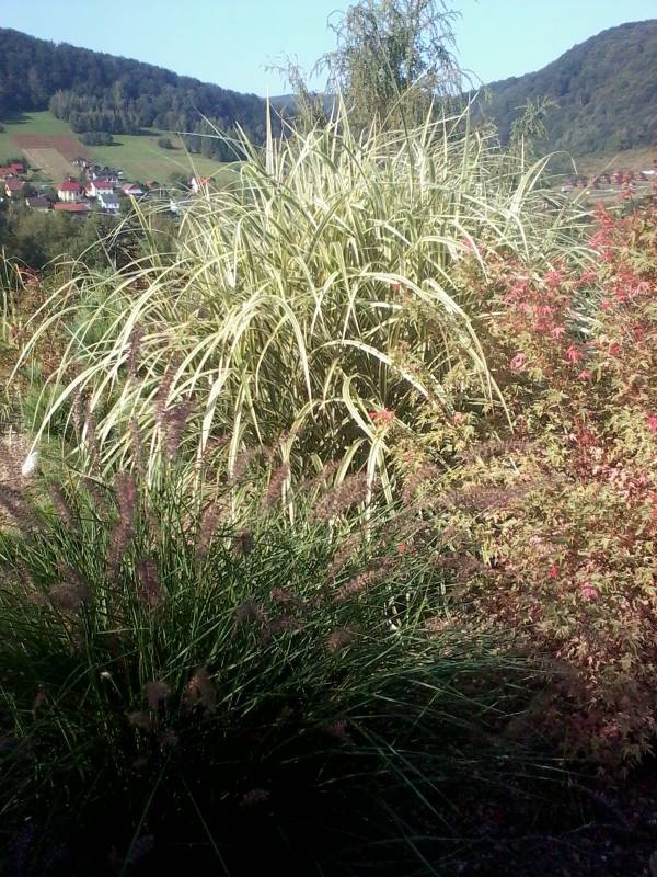 Dla mnie Variegatus jest najładniejszym miskantem . Tu z dwoma klonami palmowymi Taylor . Zdjęcia dzisiejsze .
