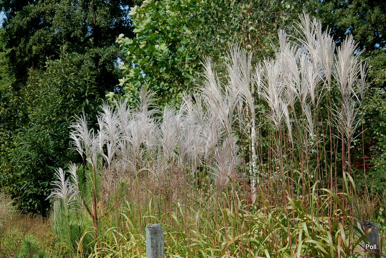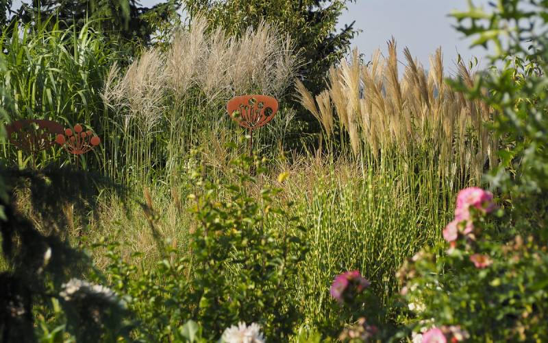 W grupie traw ozdobnych, na środku, góruje nad innymi (po lewej, z białymi kwiatostanami, miskant Memory, Rosi i miskant JP3)