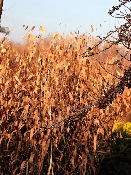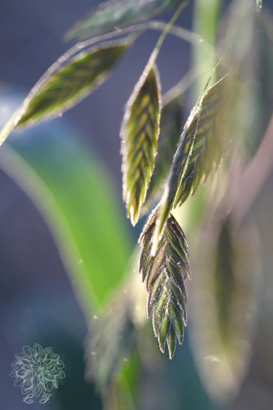 Obiedka szerokolistna (Chasmanthium latifolium) po porannym przymrozku, pierwsze promienie słońca stopiły szron.