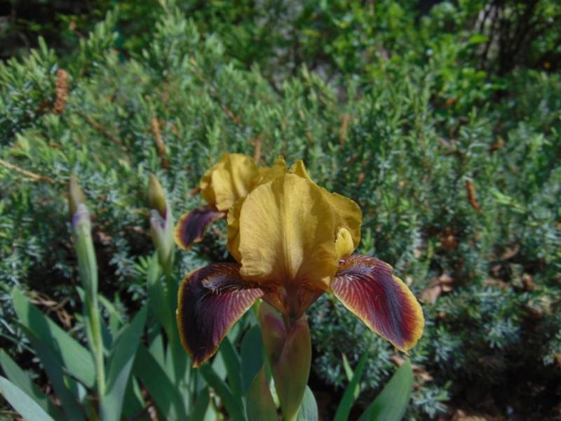 Iris balkana. Gatunek dorastający do trzydziestu cm wysokości, wcześnie kwitnący irys, o kwiatach występujących w dwóch kolorach - żółtym i purpurowym. Ma charakterystycznie wysoko sklepioną kopułę i podwijające się płatki dolne. Na początku XX wieku był namiętnie krzyżowany z innymi gatunkami irysów, jest uznawany za jednego z protoplastów irysów SDB.