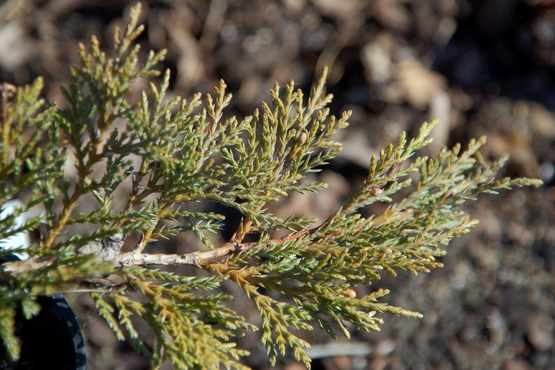 Początkowo płoży się, ale z czasem gałęzie zaczynają unosić się lekko ku górze. Igły drobne zielone z niebieskawym odcieniem. Świetnie znosi suszę.