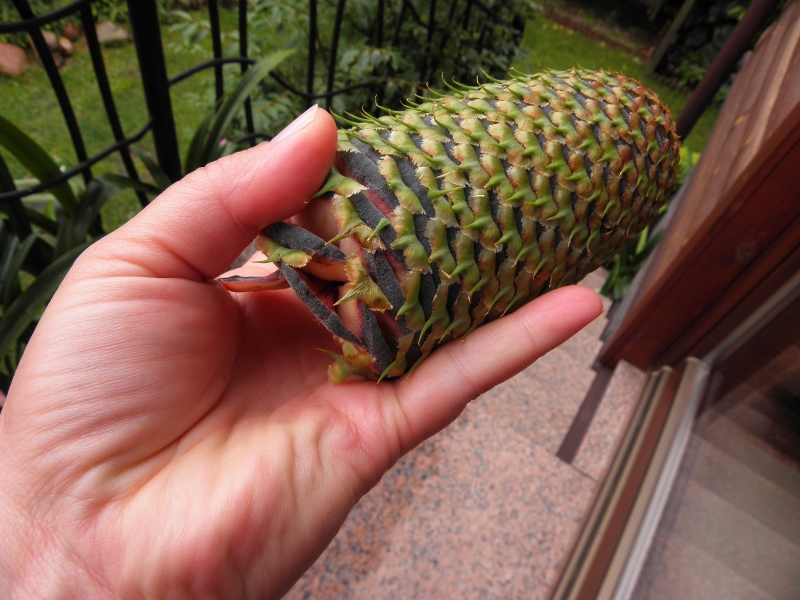 Koloru jasnobrązowego, o jasnych odstających, ostrych łuskach, duże, wzniesione pionowo. Poszczególne łuski posiadają specyficzne wyrostki.