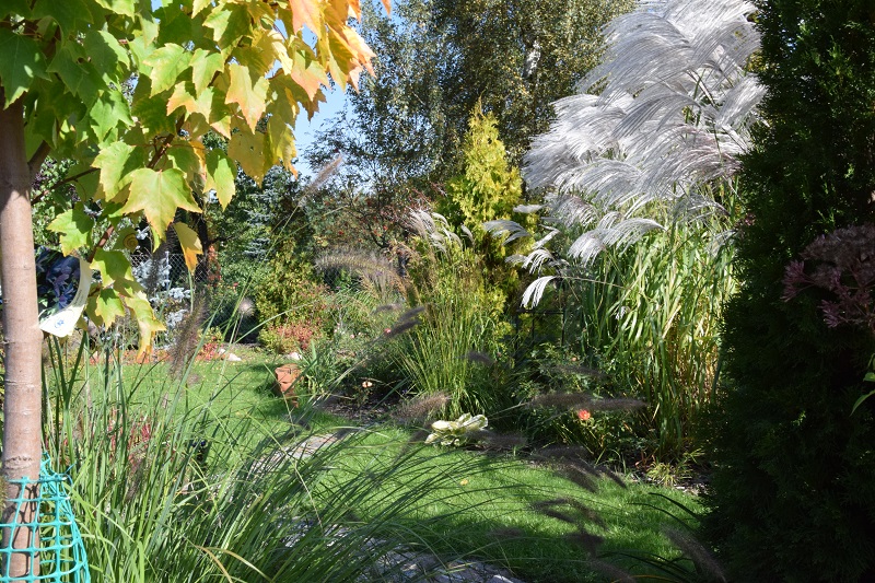 W zeszłym i w tym roku starałam się sprawdzić jak długo utrzymuje jesienne przebarwienie. Wyszło mi, że tak ok. 2 tygodni. Może nie jest rekord, ale dzięki temu, że rozmija się z drugim posiadanym przeze mnie klonem czerwonym Sun Village, jesienny spektakl wydłuża się do ok. 3 tygodni.