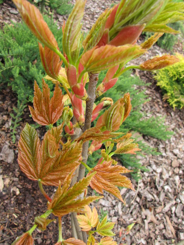Acer pseudoplatanus 'Esk Sunset' tej wiosny został dość mocno przycięty.