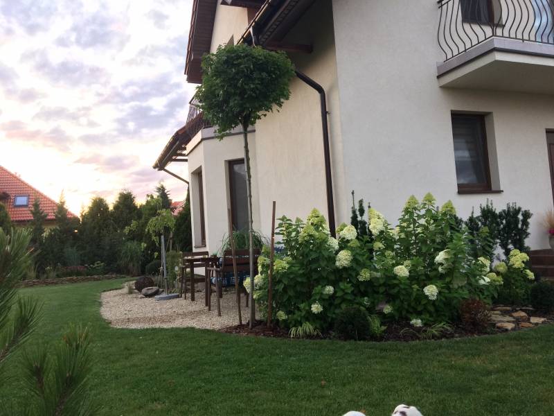 Robiąc to zdjęcie, zauważyłam, że zwracałam uwagę na to, by kulista korona pasowała do cisowych kulek na froncie... a zapomniałam, że ogromne kuliszcze rośnie przecież na lewym skraju tarasu... no pięknie mi się to drzewko wpasowało