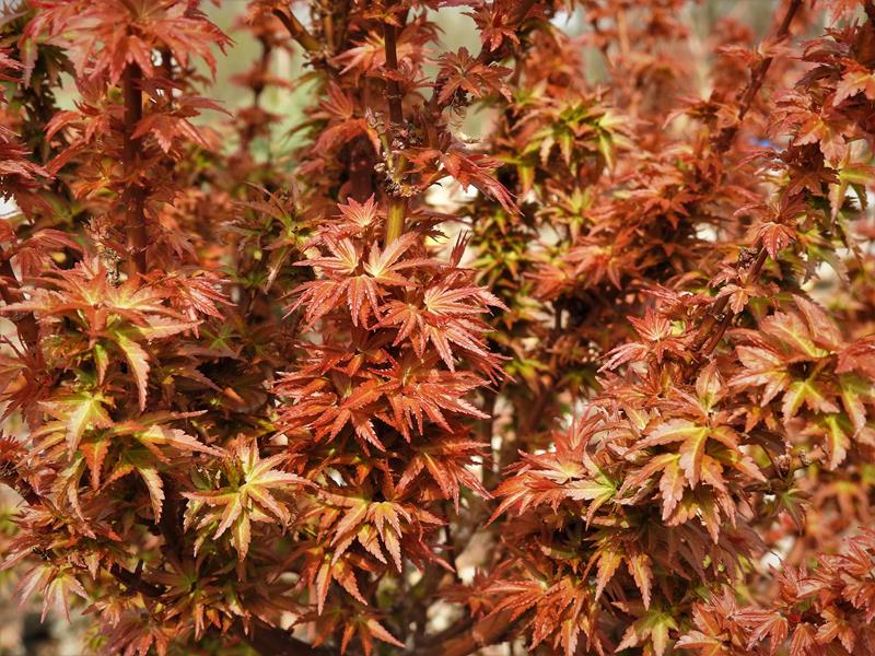 Klon palmowy 'Sharp's Pygmy' wyjątkowo ładnie przebarwia się tej jesieni.