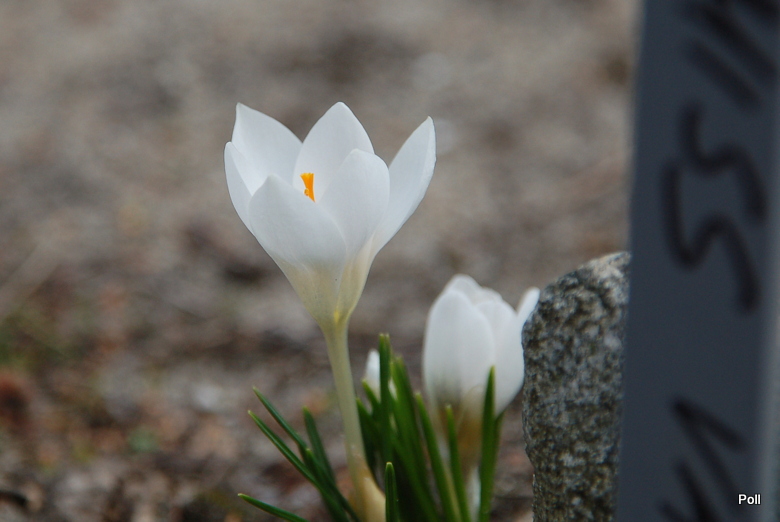 Kwiat: mniejszy kielich, kolor ciepły odcień bieli, dość ostro zakończone płatki, brązowe smugi u nasady.