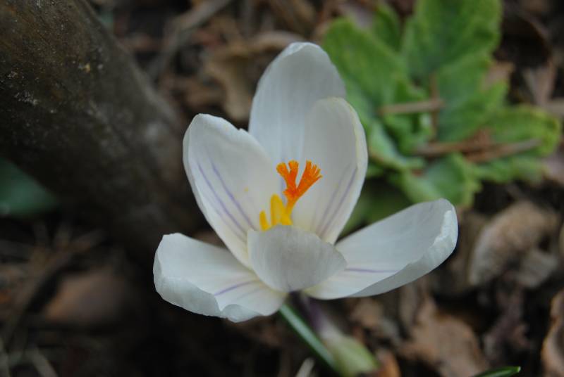 Dość nierówno, bo tylko w najbardziej słonecznych miejscach rozpoczął kwitnienie krokus wiosenny (Crocus vernus) 'Jeanne d'Arc'