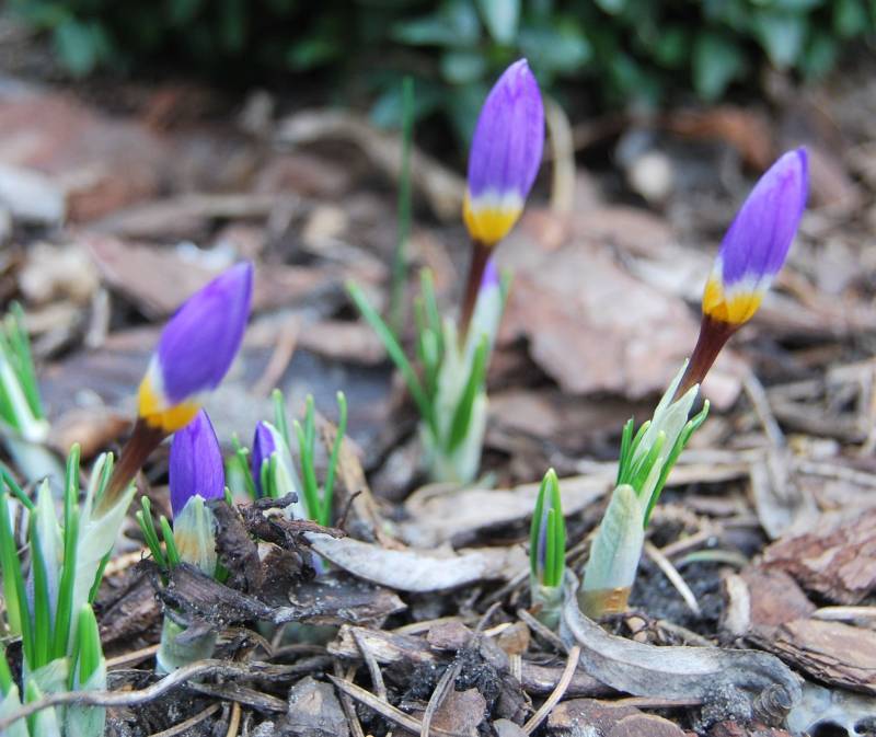 Moje krokusy 'Tricolor' dopiero wynurzyły się z ziemi i niektóre próbują - mimo kiepskiej pogody - rozkwitnąć