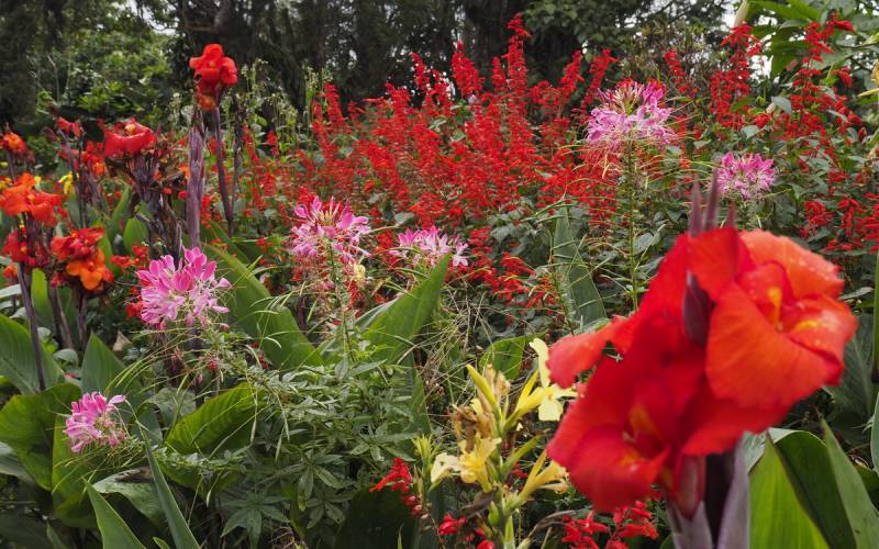 Kwiaty zebrane w szczytowe kwiatostany, w odcieniach czerwieni, różu, mogą być też białe i łososiowe. Kwitnie od czerwca do przymrozków.
