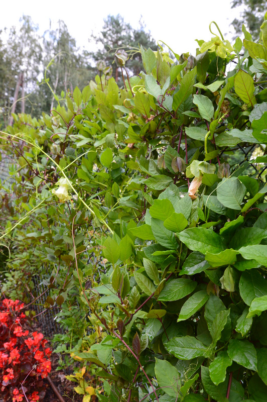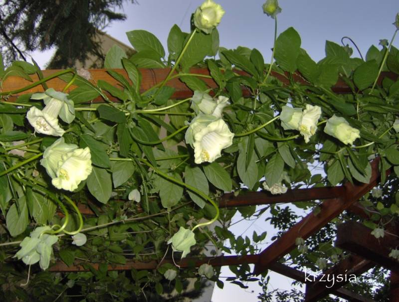Na samym początku mojej przygody z kobeą, miałam ją jeden sezon w gruncie, bo taras, na który była szykowana, nie zdążył powstać. To było szaleństwo :omg , rozrosła się niesamowicie, cztery sadzonki zarosły mi kilkanaście metrów płotu, kwitła jak szalona :kocham . Na tarasie w ogromnej donicy nigdy nie jest taka wyrywna ;). Kiedy zwarzył ją przymrozek, nieźle się namęczyłam, żeby ją usunąć, a korzenie miała grube jak powrozy zdziwko . Zrujnowałam sobie całą rabatę wyciągając je, zresztą nie wiem po co polewkamax .