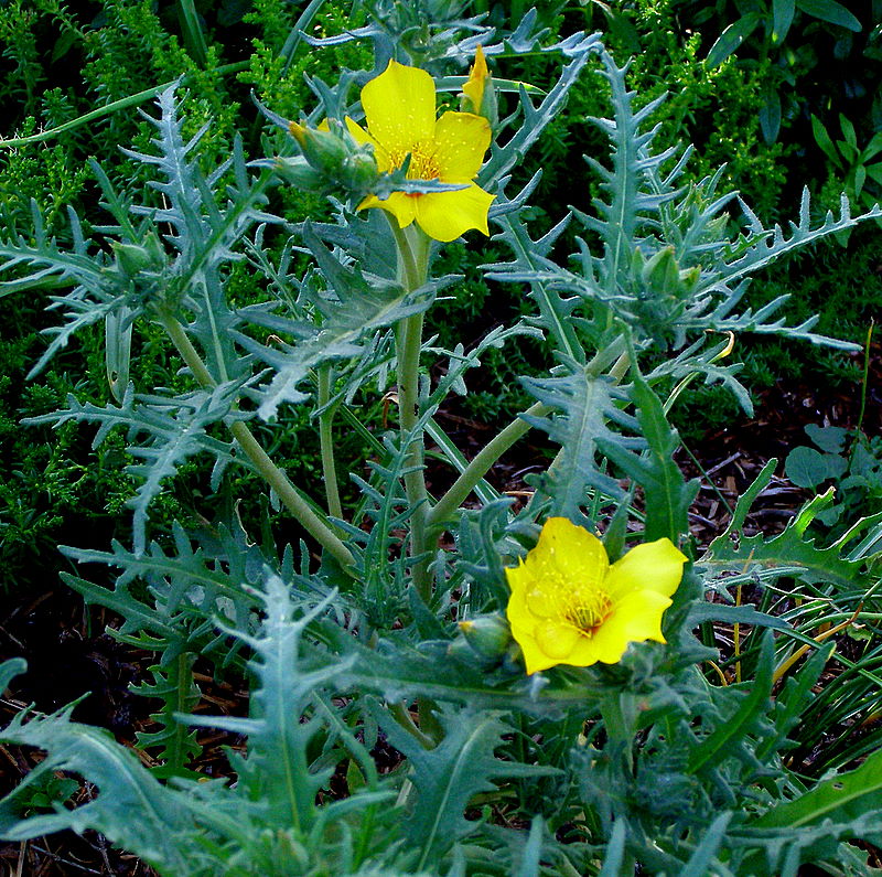 Liście i łodygi mają sinawy kolor, a od czerwca do września pojawiają się spore, złocisto-żółte kwiaty o pięciu sercowatych płatkach, z "czupryną" dekoracyjnych pręcików.