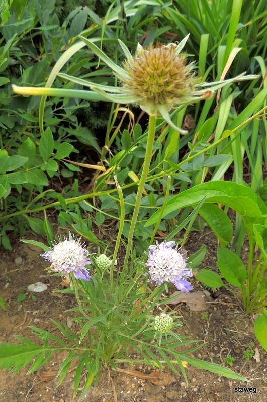 Wczesny atak tak śnieżnej i mroźnej zimy przerwał skabiozową sielankę, ale i teraz zaschnięte nasienniki ładnie wyglądają na tle śniegu. Na zdjęciu przed driakwią gołębią niski miskant Little Miss, ładnie komponuje się z okrągłą kępką sąsiadki.