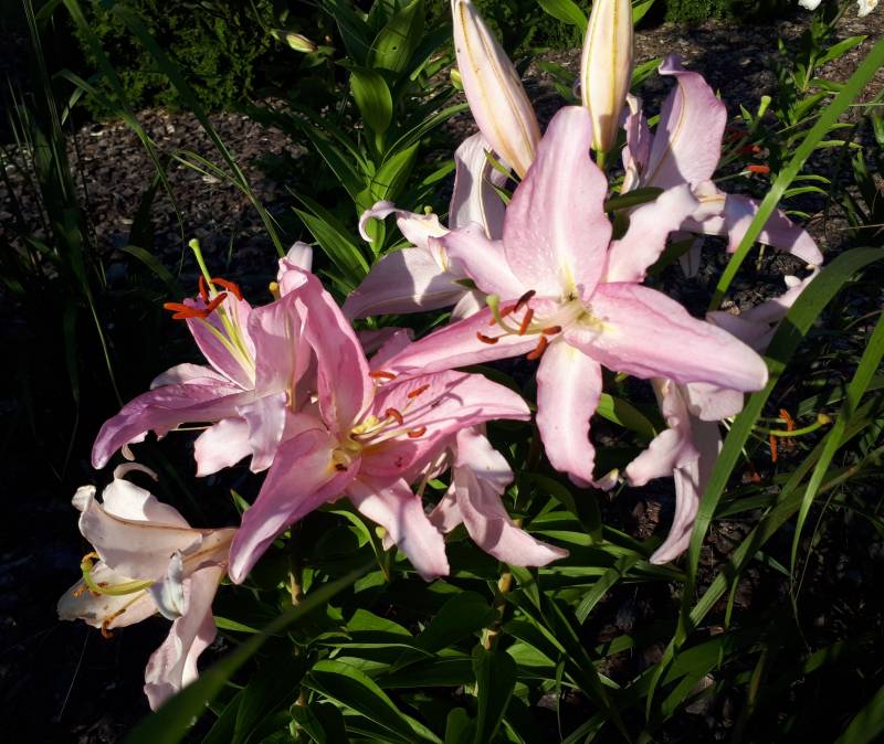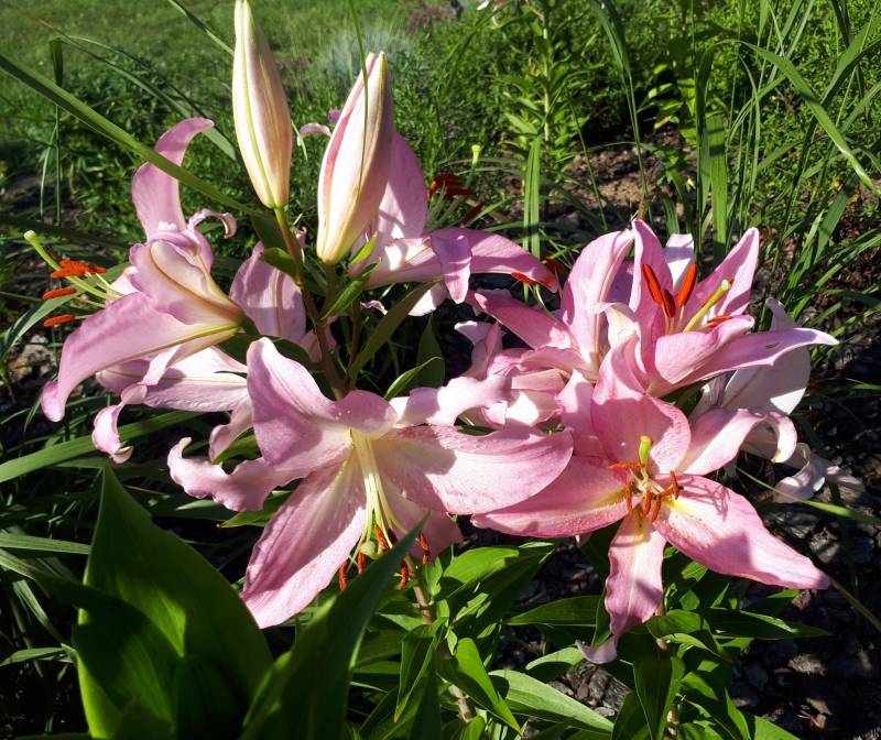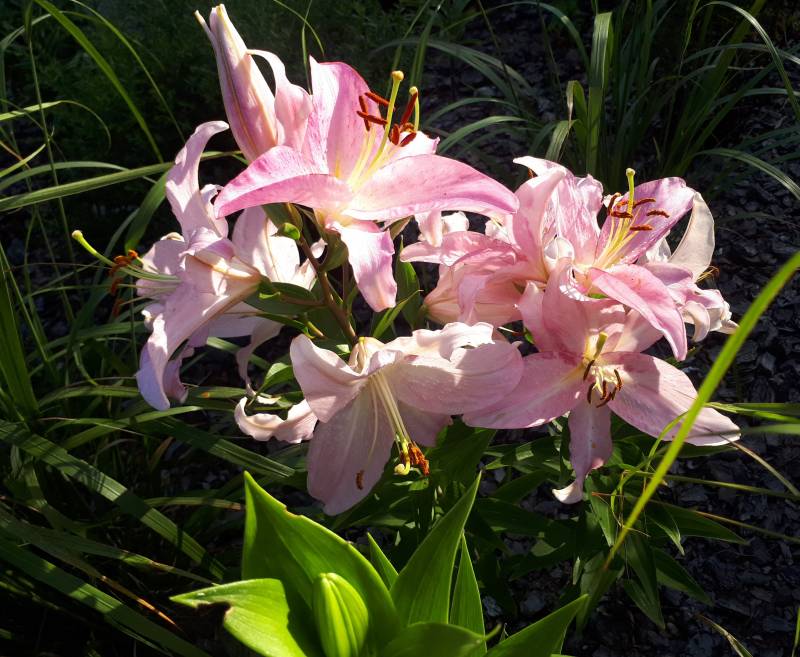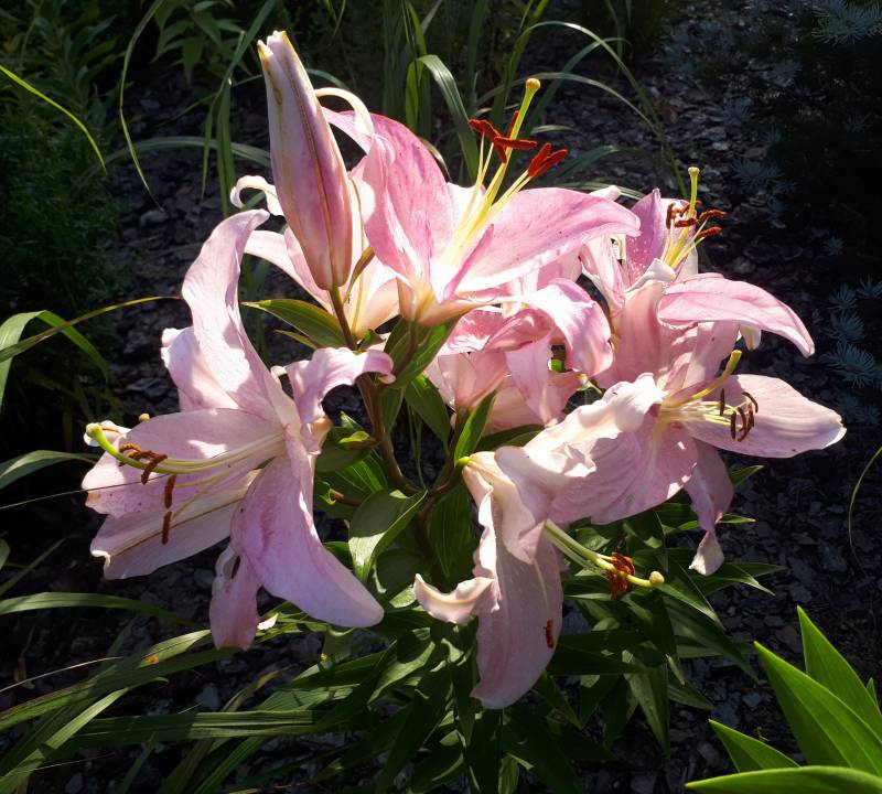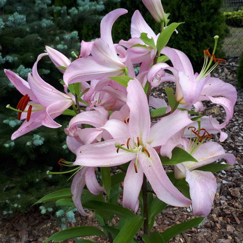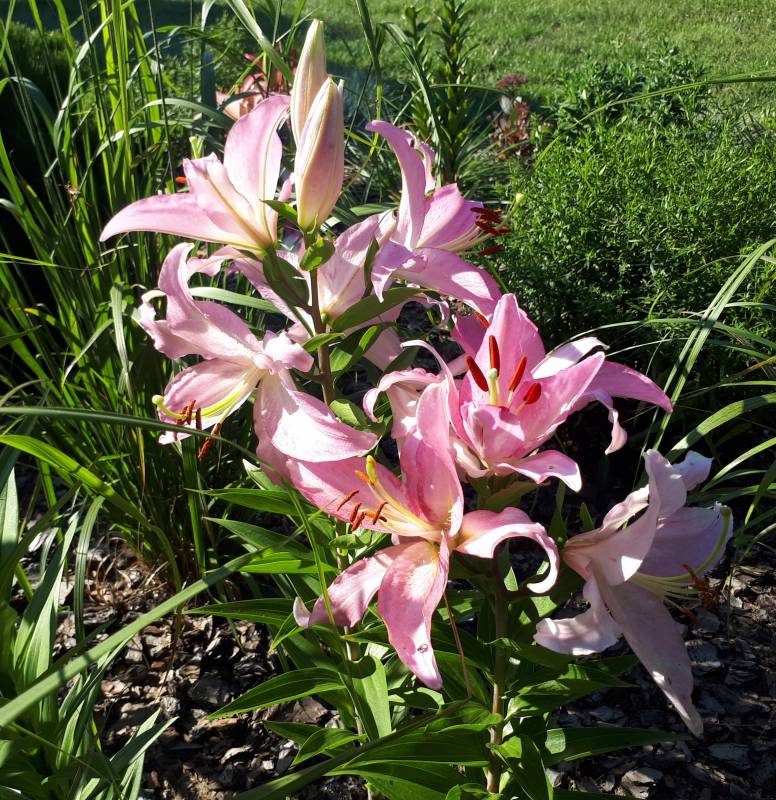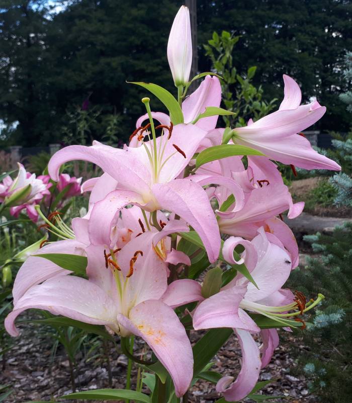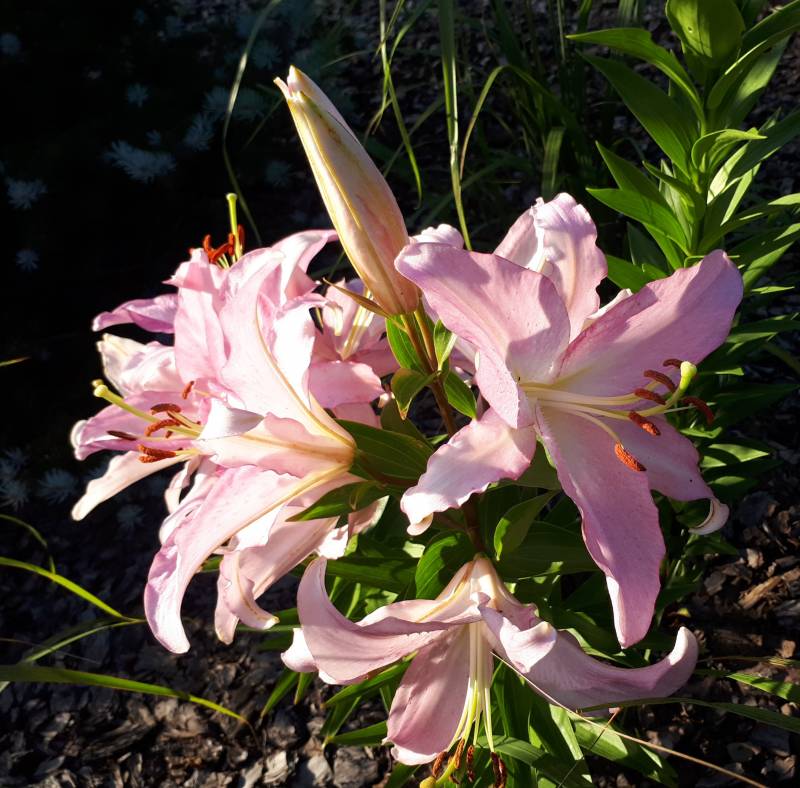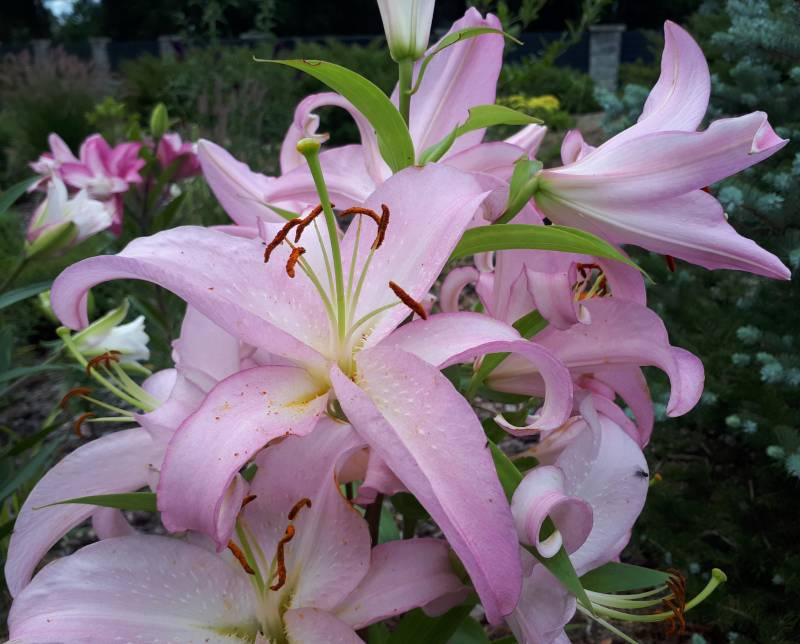 Kwiaty: szeroko rozwarty, bladoróżowy z białymi smugami rozchodzącymi się od gardzieli przez środek płatków