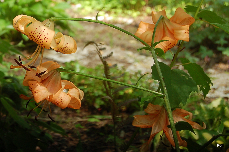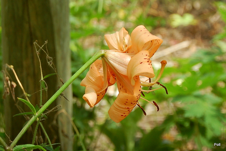 Kwiat: turbanowy, mocno wywinięty, skierowany do dołu, w kolorze pomarańczowo-łososiowym, mocno nakrapiany brązem