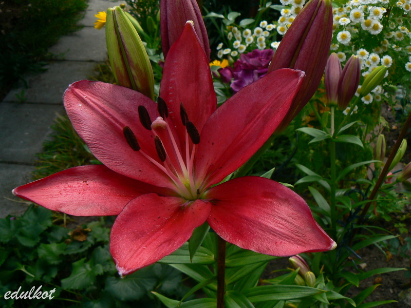 Wysokość: 130 cm Kwiat: czerwony Kwitnienie: VI-VII Wymagania: jak u mieszańców azjatyckich – przeciętna ziemia jaką zwykle mamy w ogródkach, gdzie dobrze rosną warzywa, czyli ziemia lekko kwaśna (pH 5,5-6,5) lub obojętna Zapach: brak Mrozoodporność: średnia