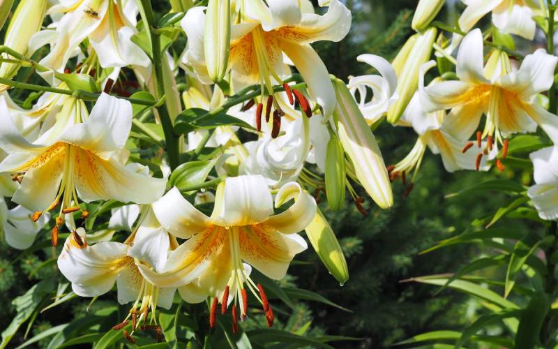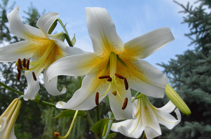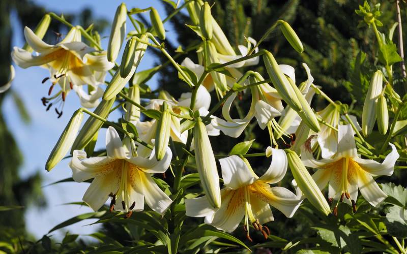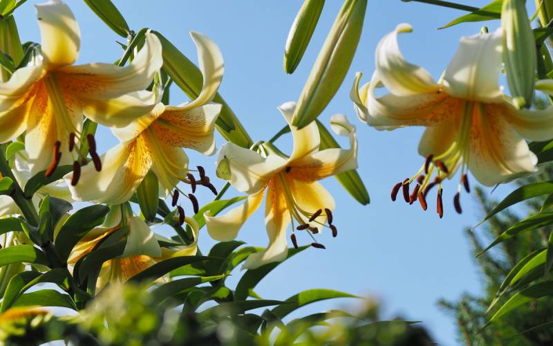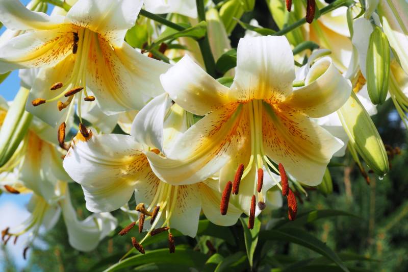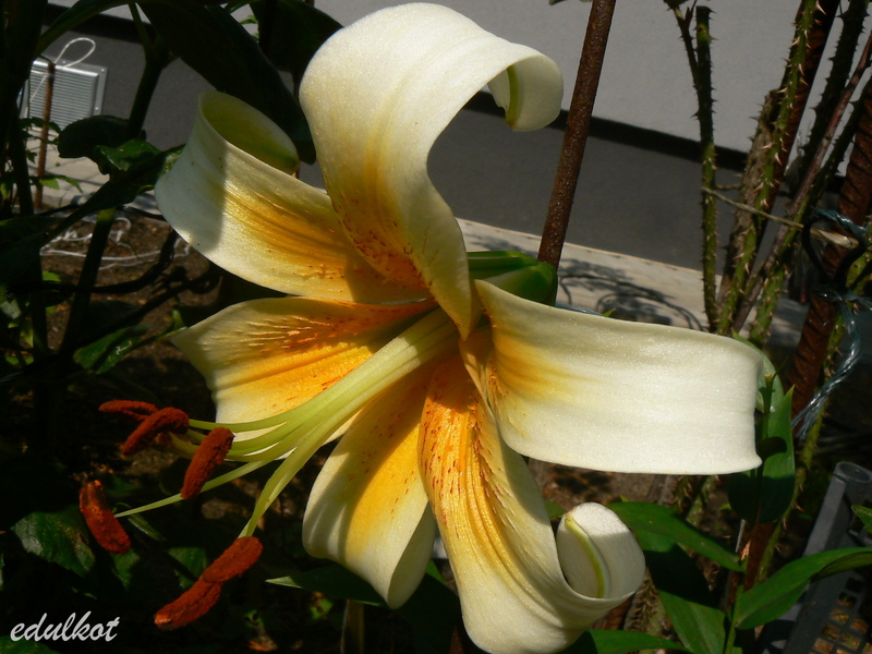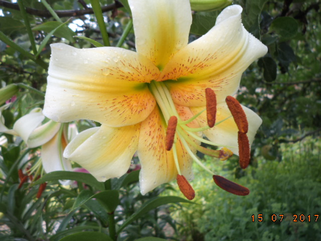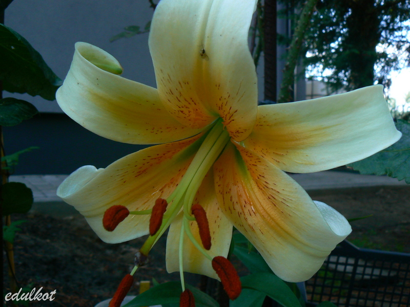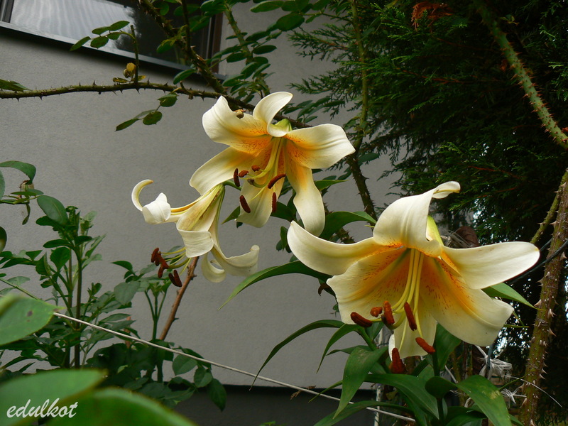 Kwiaty: kremowobiałe podbarwione na żółto z rdzawymi cętkami, duże 20-25 cm;