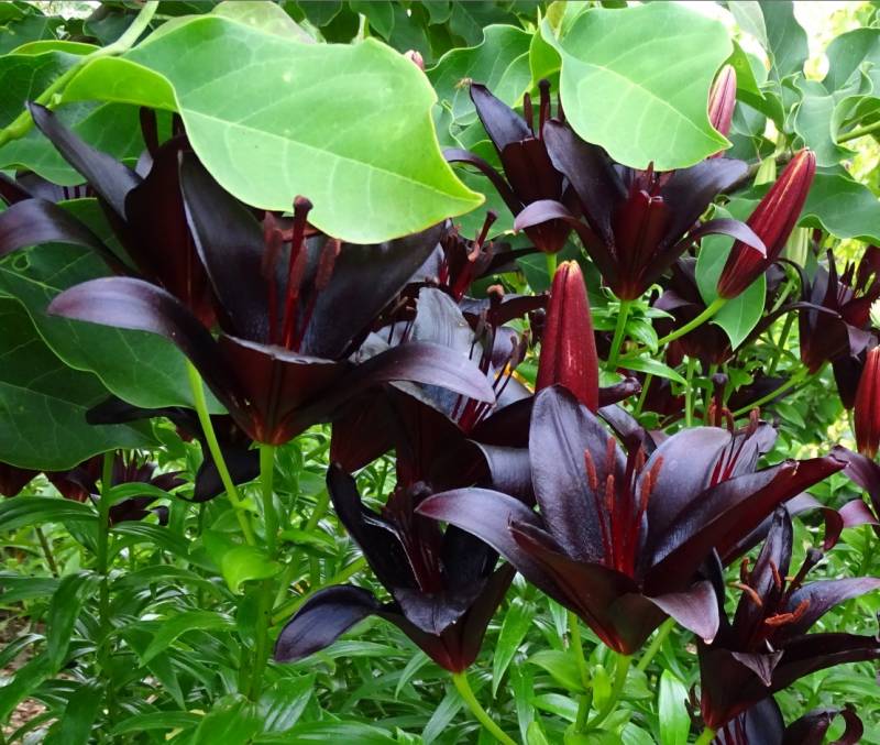 Kwiaty: fioletowo czarne, w cieniu wyglądają prawie czarne, skierowane do góry;