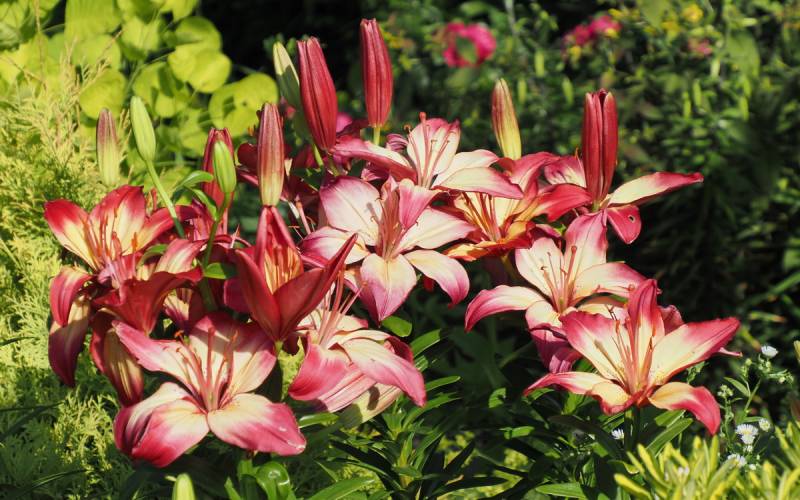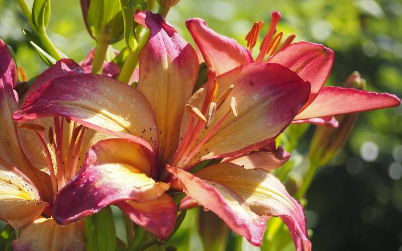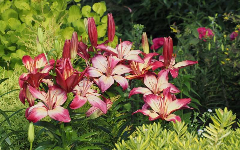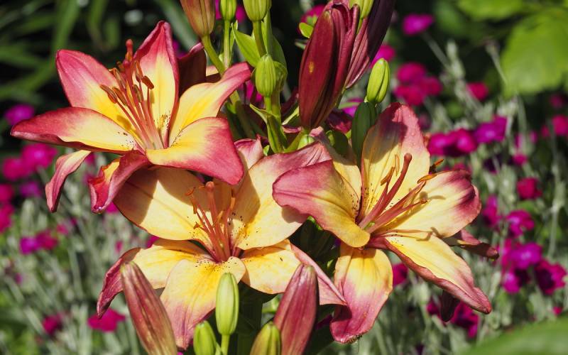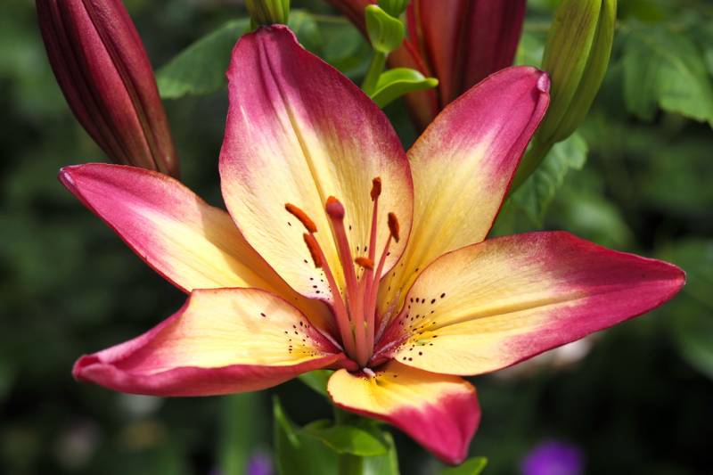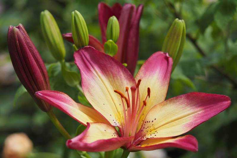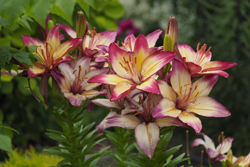 Wysokość: 110 - 120 cm, pędy mocne i sztywne Kwiat: dwukolorowy: aksamitny-żółty i lekko nakrapiany środek z malinowo-różowymi końcówkami, lilia bardzo efektowna i widowiskowa Kwitnienie: połowa lipca Wymagania: jak u mieszańców azjatyckich - przeciętna ziemia ogrodowa, może być lekko kwaśna (pH 5,5-6,5)