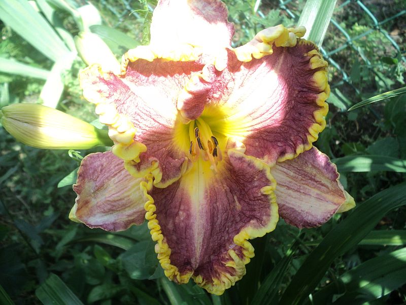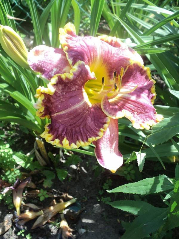 Kwiaty:koloru lawendy , z żółtą pofałdowaną krawędzią i zielonym gardłem , średnica 16 cm