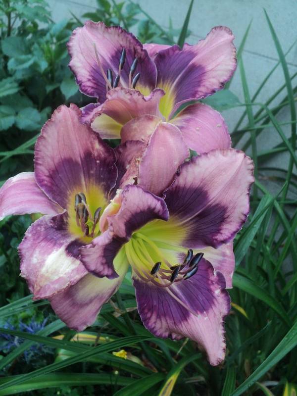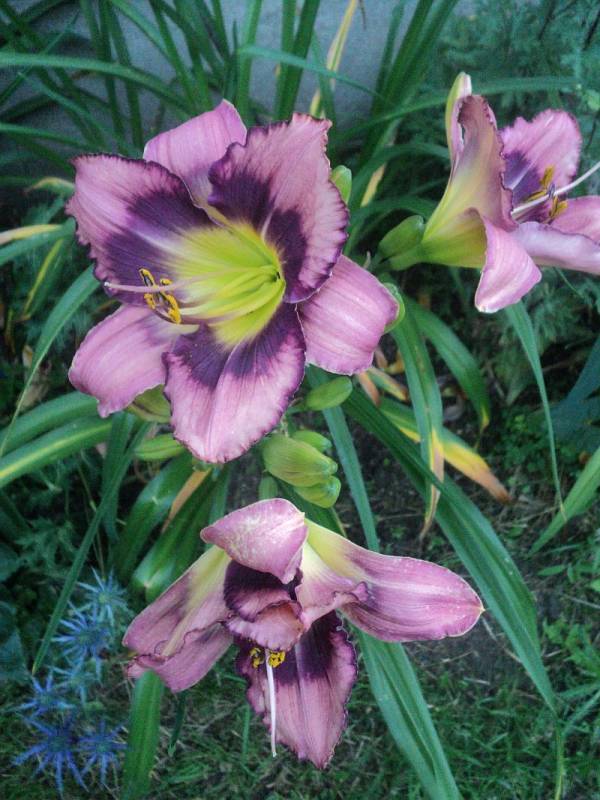 Kwiaty:duże ,płasko otwarte,lawendowo-fioletowe , z ciemniejszym fioletowo -niebieskim okiem i taką samą krawędzią płatków , gardło żółte, śr ok 16-17 cm