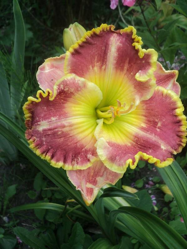 Kwiaty: różowe , z żółtym znakiem wodnym , zielonym gardłem i wyraźną żółtą falbanką , średnica kwiatu ok 16 cm.