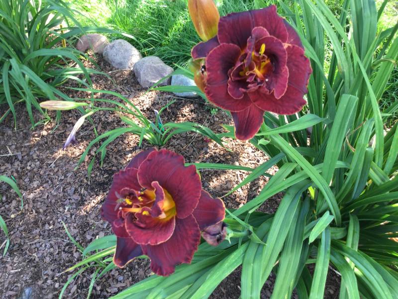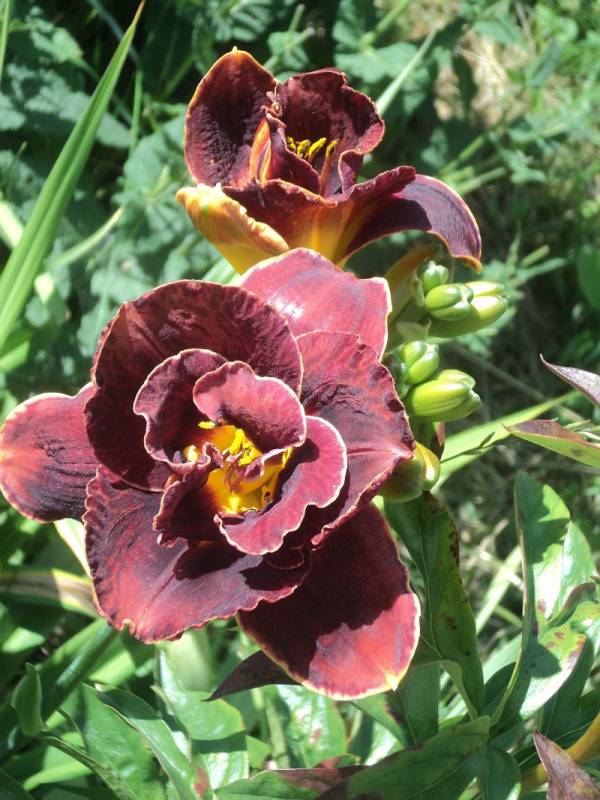 Twój liliowiec to może być Voodoo Dancer. One są do siebie bardzo podobne tylko VD ma kolor "czarno filetowy z zieloną gardzielą" zbliżony do czekoladki z odcieniem fioletu - wg mnie) a NE jednak "akuratnie wiśniowo-czerwony z białym brzegiem płatków i zieloną gardzielą" Kolory podałam za AHS.