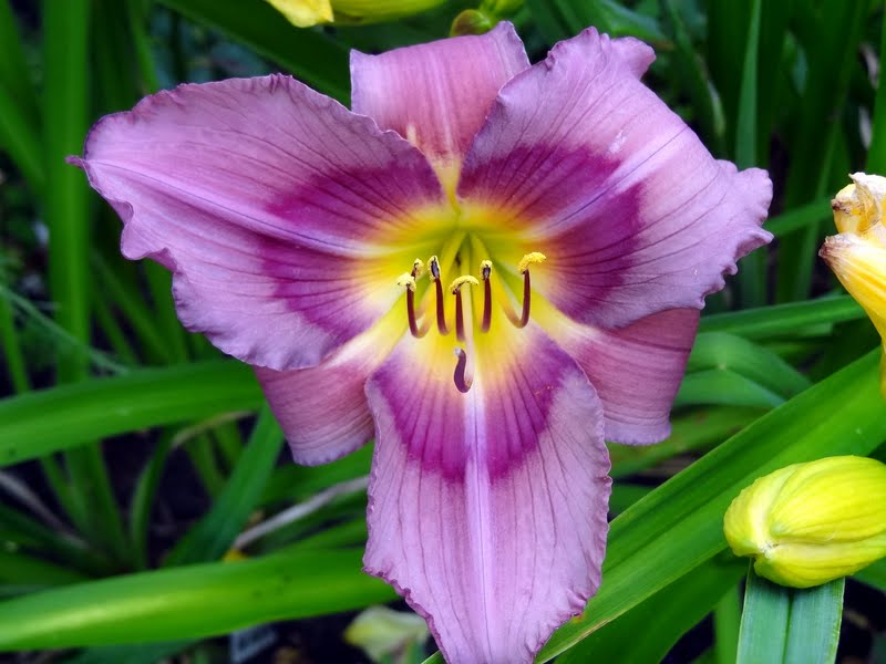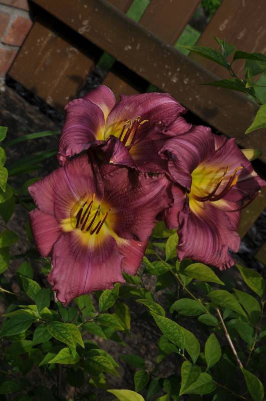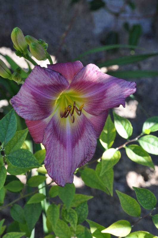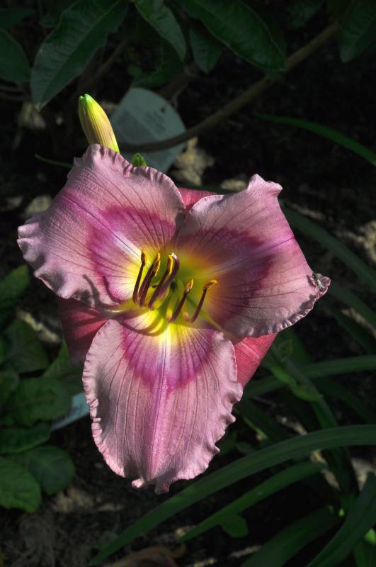 kwiat: 14cm w kolorze foletowo-różowym, z wyraźnym mocno różowym okiem i zielonym gardłem. Wykazują sporą zmienność w zależności od pogody.