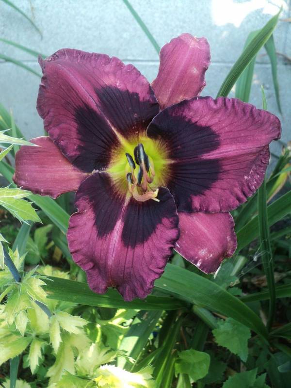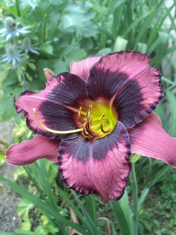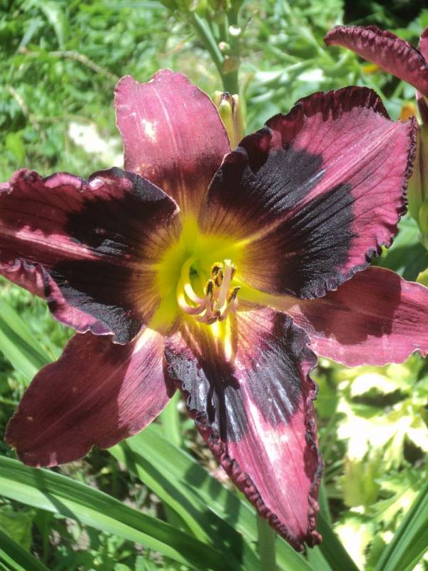 Kwiaty: kwiaty purpurowe , z purpurowo-czarnym okiem i obrzeżem, gardziel kwiatu zielona , średnica 15 cm . Zakwita w lipcu .