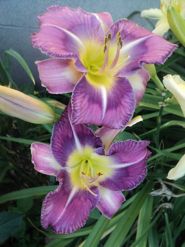 Kwiaty: jasno fioletowe z dodatkiem różu ,z lawendowym okiem i żółtym centrum, śr 15-17 cm Zakwita w lipcu .