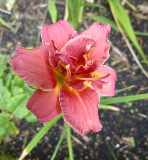 kwiat 5 cm, czerwony z zieloną gardzielą, podobno pełny w 100% i może powtórzyć kwitnienie. U mnie tylko czasem jest pełny (?).