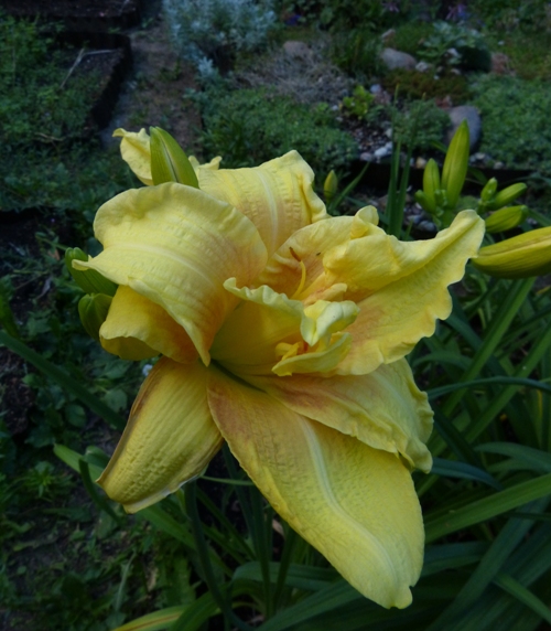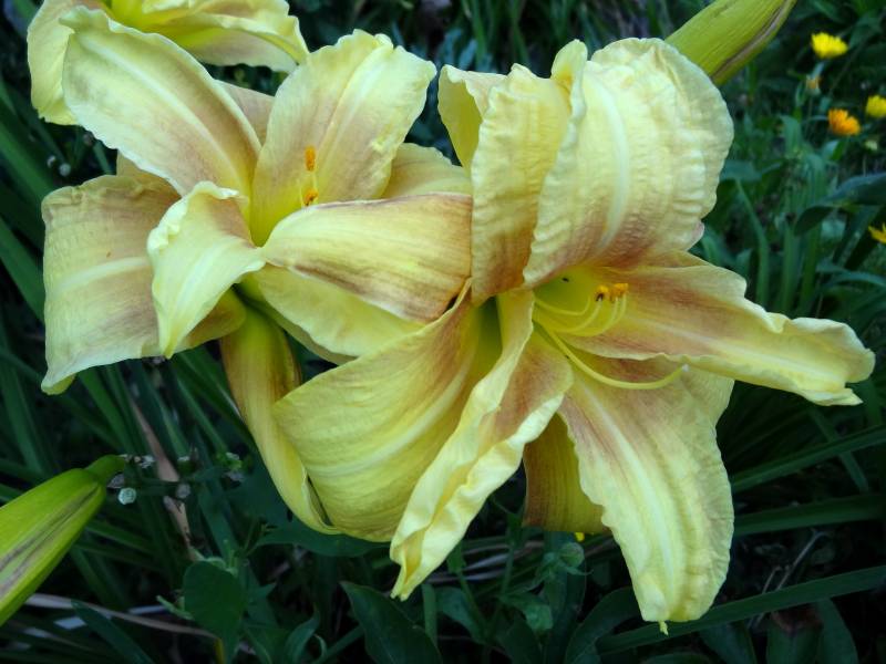 bloom 13 cm, podwójny, jasno żółty z czerwonymi cieniami na jasnożółtym oku i gardzieli.