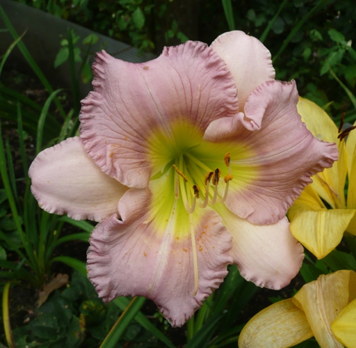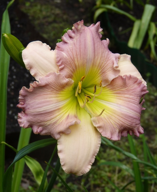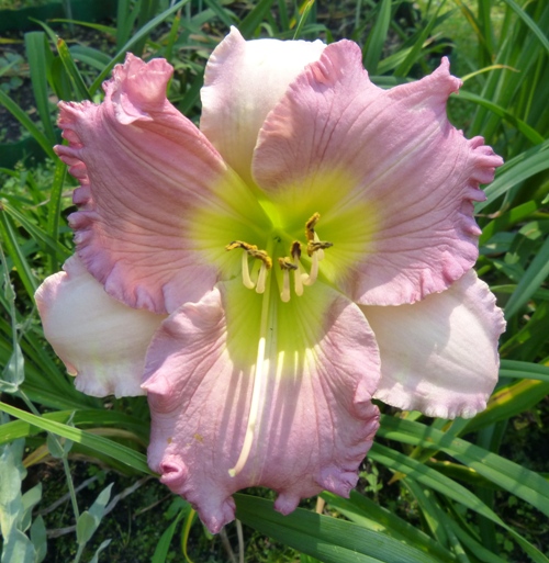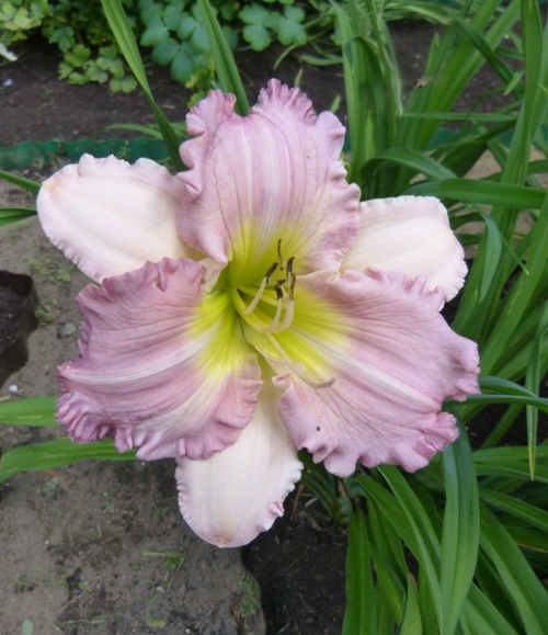 kwiat 15 cm, lawendowo różowe petale, jaśniejsze sepale, falbanka, oko prawie niewidoczne, zielono-żółta gardziel. Wybarwienie kwiatów bardzo zależne od pory dnia, nasłonecznienia. Słabo przyrasta ale pięknie kwitnie