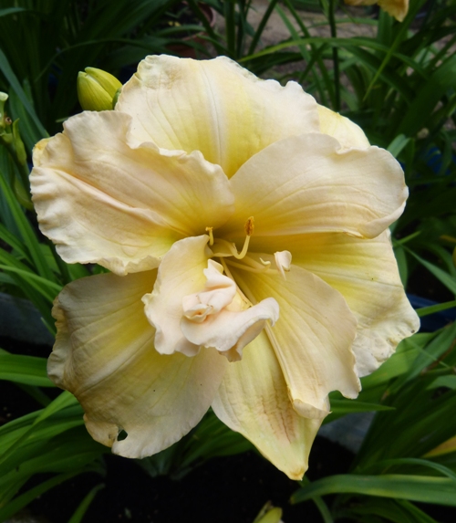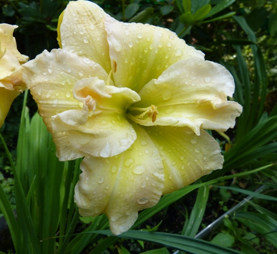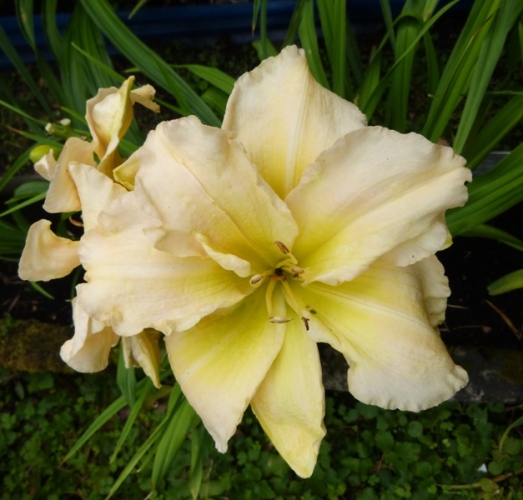 kwiat 12 cm, pełny w 80%, kremowo biały z zielonkawą gardzielą, może powtarzać kwitnienie