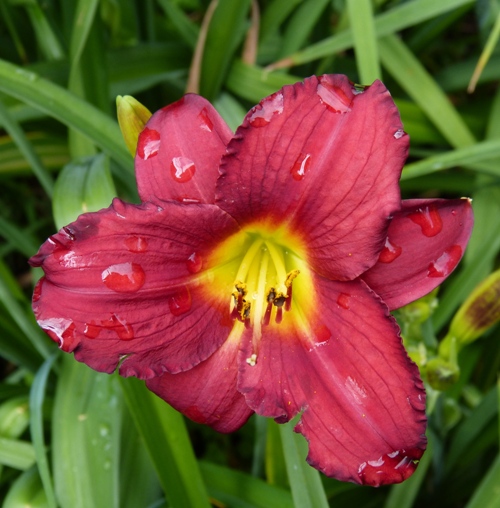 kwiat 8 cm, podobno powtarza kwitnienie, czerwony z zieloną gardzielą. Wg mnie to ta czerwień z odcieniem bordo lub czerwień kardynalska.