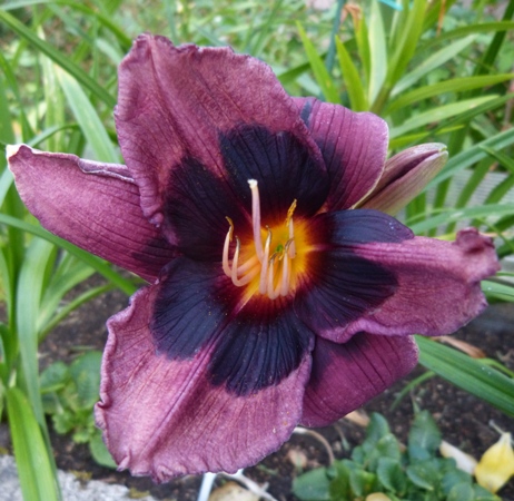 kwiat 11 cm, ciemno purpurowy z prawie czarnym okiem z żółto zieloną gardzielą, może powtarzać kwitnienie.