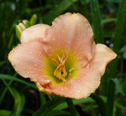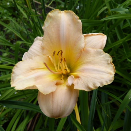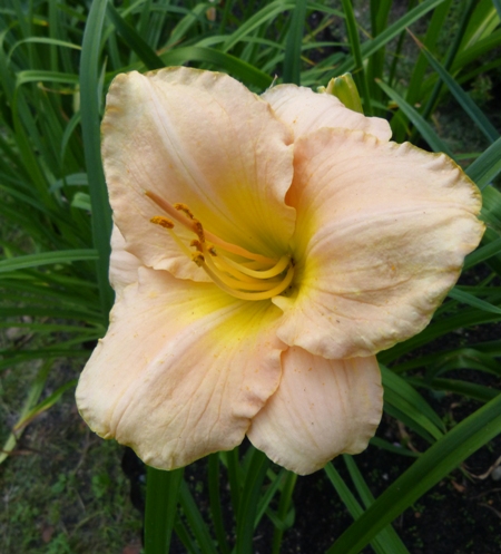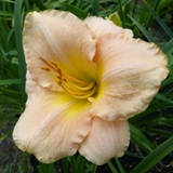 kwiat 13 cm, kości słoniowej z odcieniem pastelowego różu, dotknięta brzoskwinią złota krawędź (płatków) z szeroką żółtą aureolą (okiem) i limonkowo zieloną gardzielą (w oryginale wg AHS: Pastel ivory pink touched peach edged gold and wide yellow halo with lime green throat) Kolor określał jakiś poeta..... recourse Ponoć powtarza kwitnienie i pachnie :)