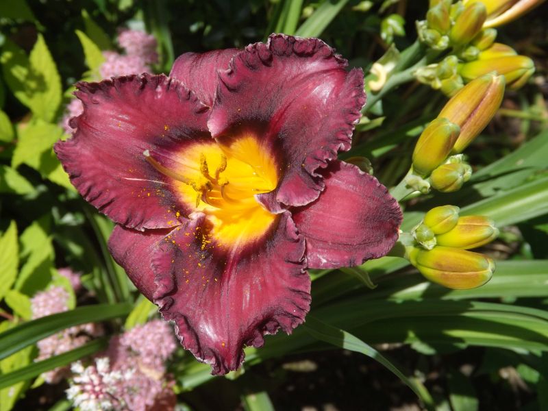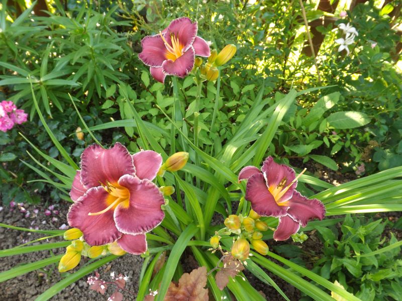 wysokość 60 cm, kwiat 9 cm, fioletowy z żółtozieloną gardzielą, może powtórzyć kwitnienie.