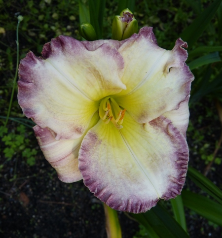 kwiat 14 cm, kreomowy z lawendową lamówką i zieloną gardzielą.