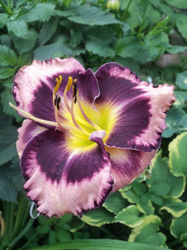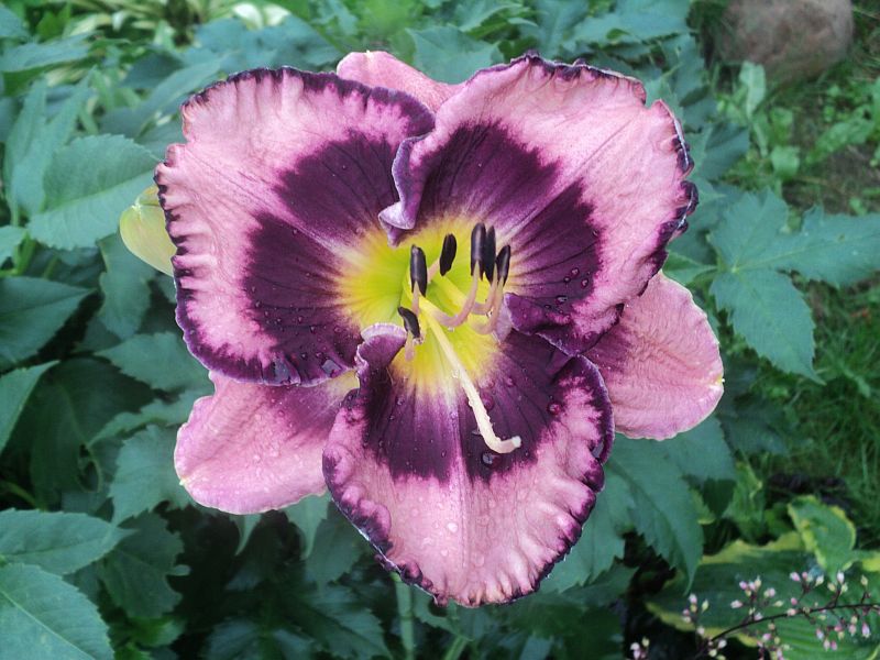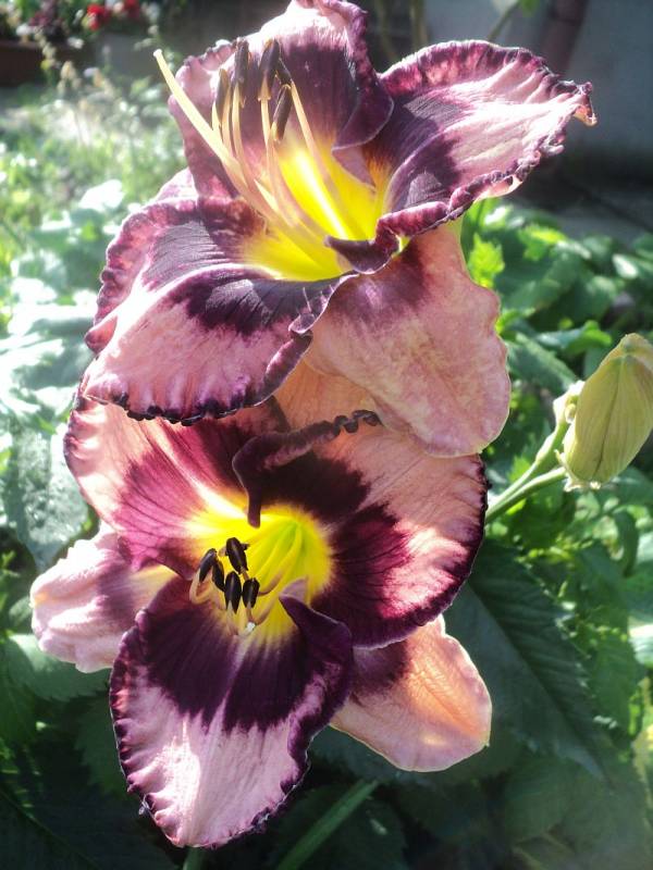 Kwiaty: kwiaty różowe z szerokim fioletowym okiem i obramowaniem płatków , gardło zielone.pofałdowane zewnętrzne krawędzie petali .Rysunek środkowej części okwiatu przeniesiony na sepale. Wielkość kwiatu ok 15 cm.