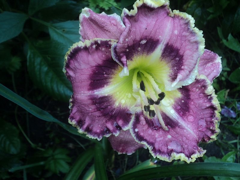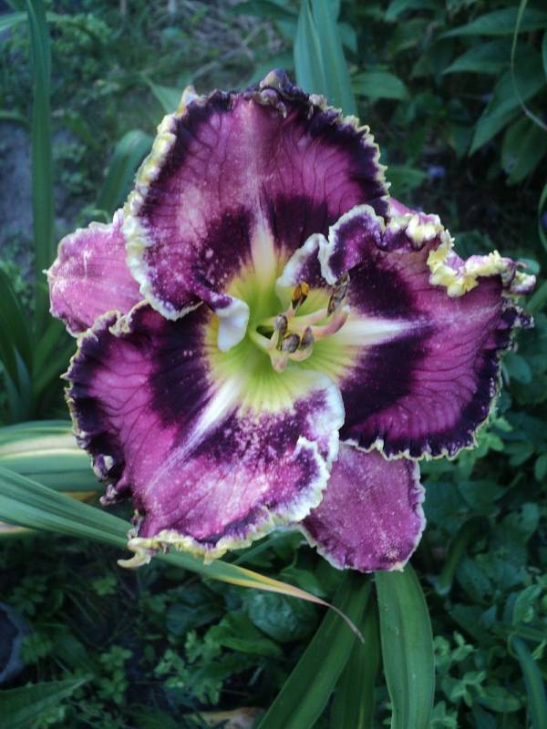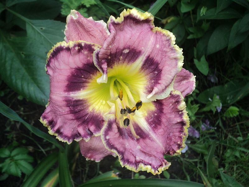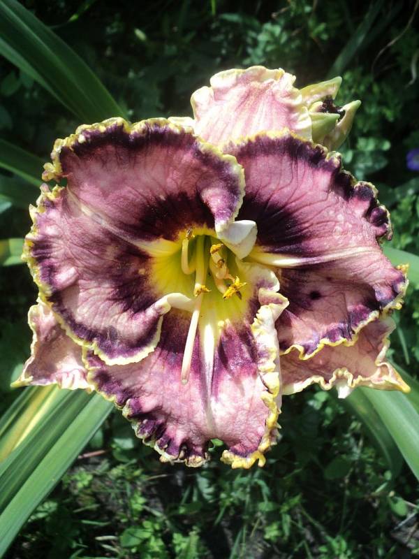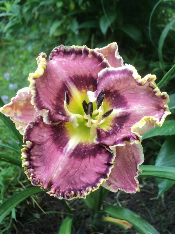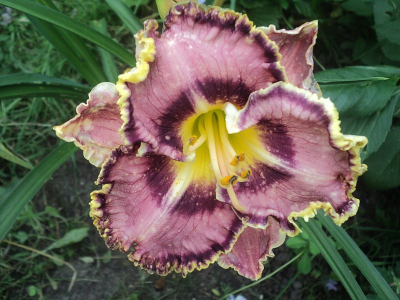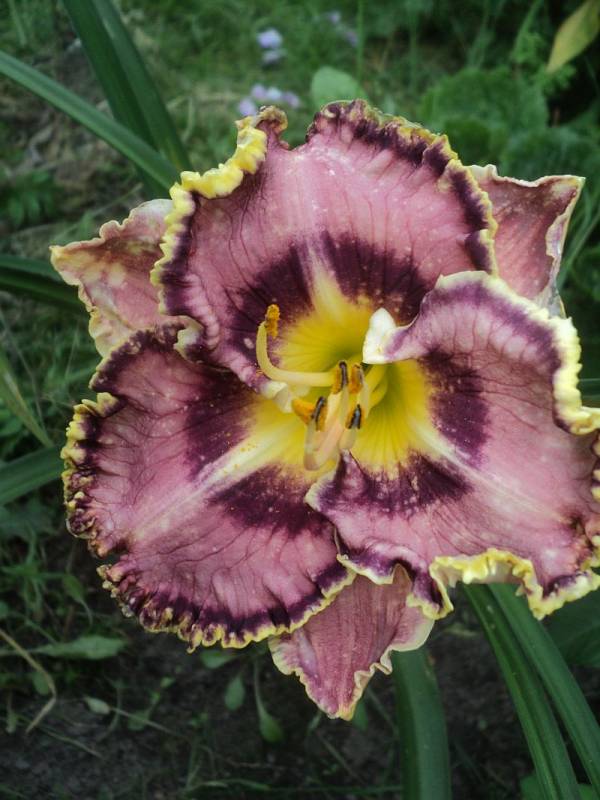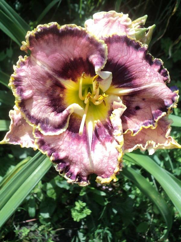 Kwiaty: kwiaty różowe z purpurowym okiem i dwubarwną złoto-purpurową falbanką na brzegach petali , gardło zielonożółte . Wielkość kwiatu ok 14 cm.