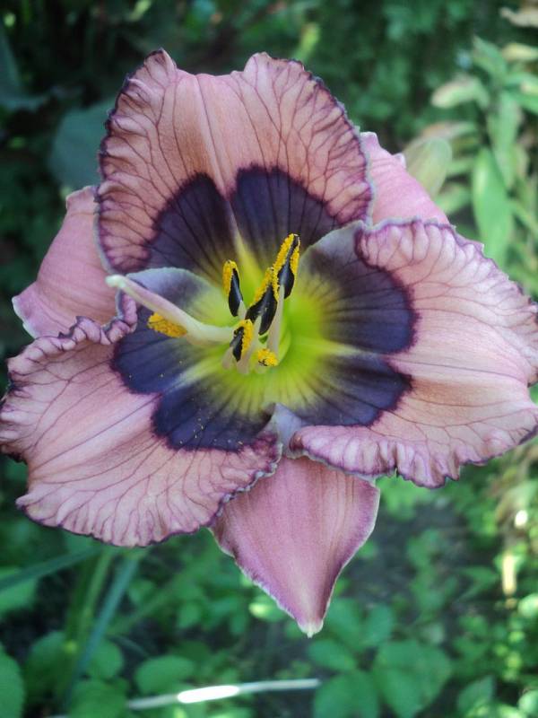 Kwiaty: kwiaty różowe z niebieskim szerokim okiem , wykończenie płatków w kolorze oka , płatki fioletowo żyłkowane .Gardziel zielona. Wielkość kwiatu ok 11 cm.