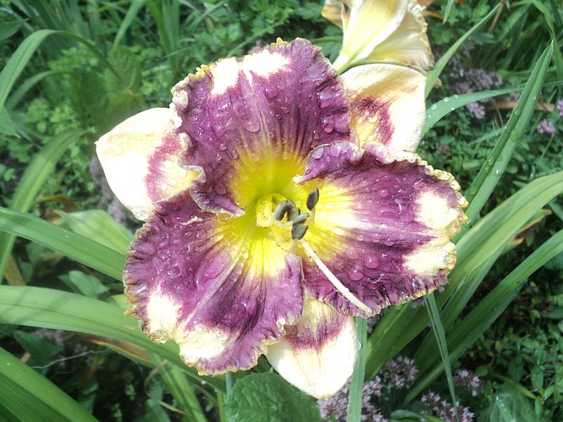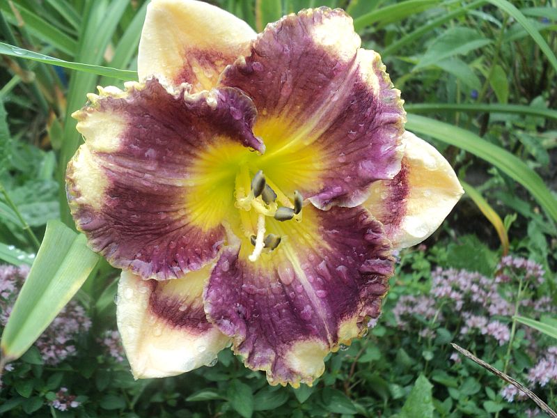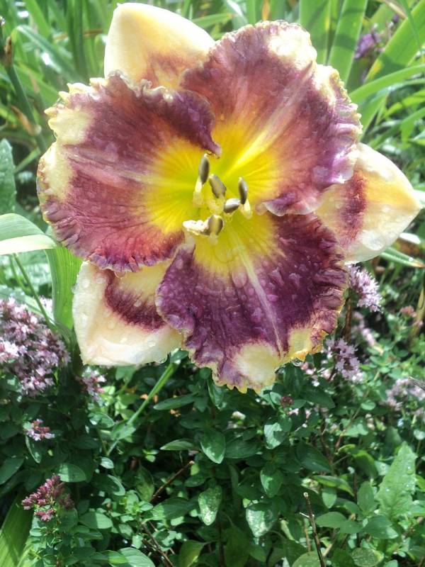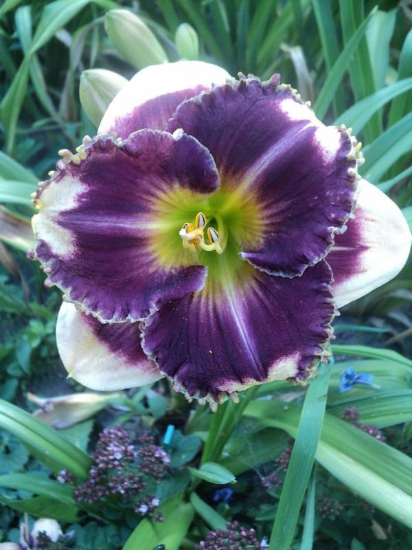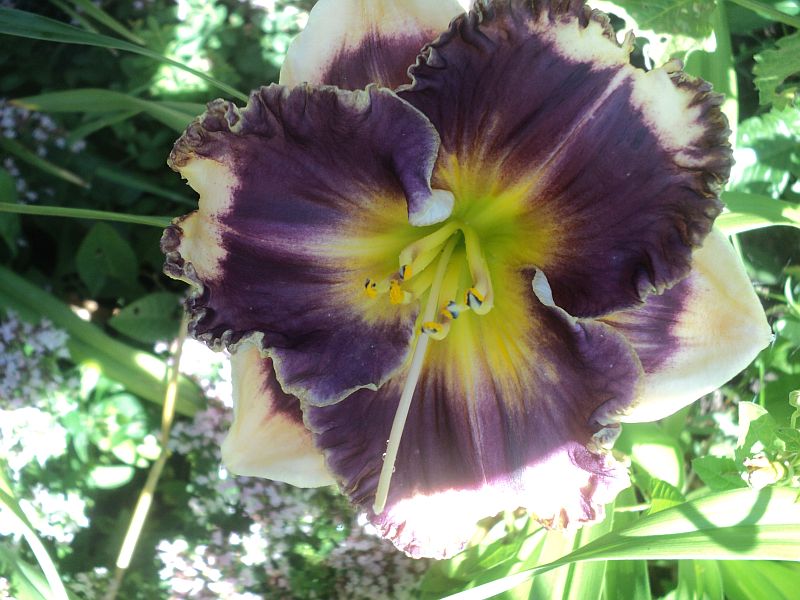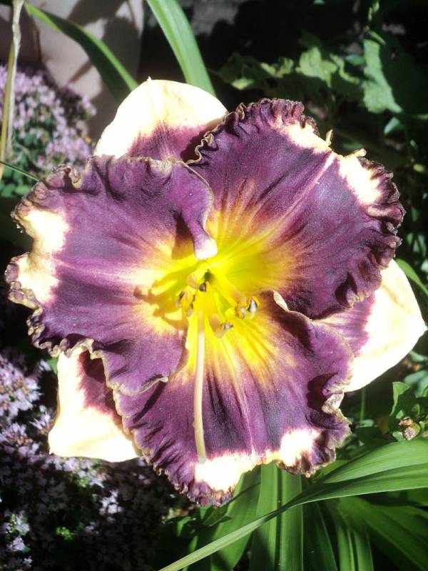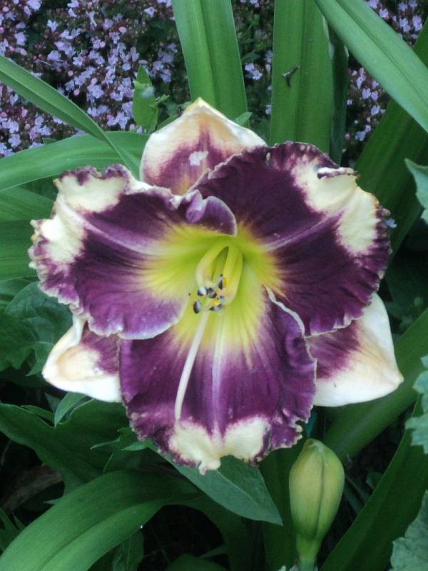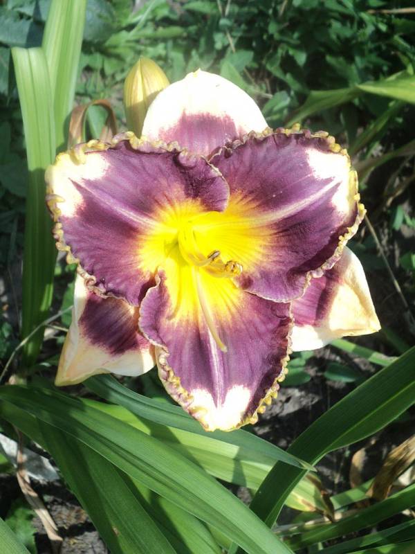 Kwiaty: kwiaty w kolorze kremowym z szerokim śliwkowo-fioletowym okiem , płatki wykończone falbaną w kolorze oka . Gardziel cytrynowo- zielona .Wielkość kwiatu ok 14 cm.