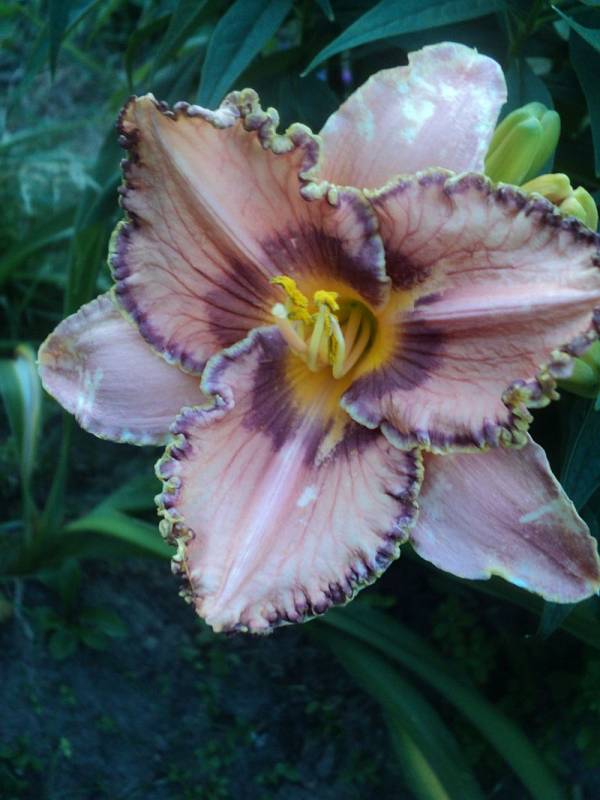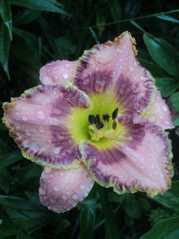 Hodowca: Yost, 2002 Wysokość: ok 70cm Kwiaty: kwiaty w kolorze różowo- lawendowym z ciemnym lawendowym okiem i lawendowo-zieloną falbaną , gardziel złota . Wielkość kwiatu ok 15 cm. Stanowisko: słoneczne do półcienistego. Mrozoodporność: zimuje bez okrycia .