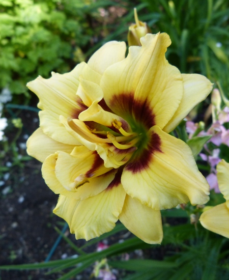jasno żółty z burgundowym okiem i zieloną gardzielą, może powtarzać kwitnienie