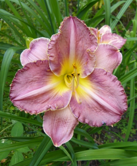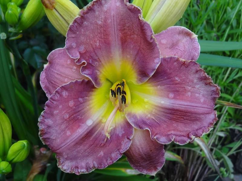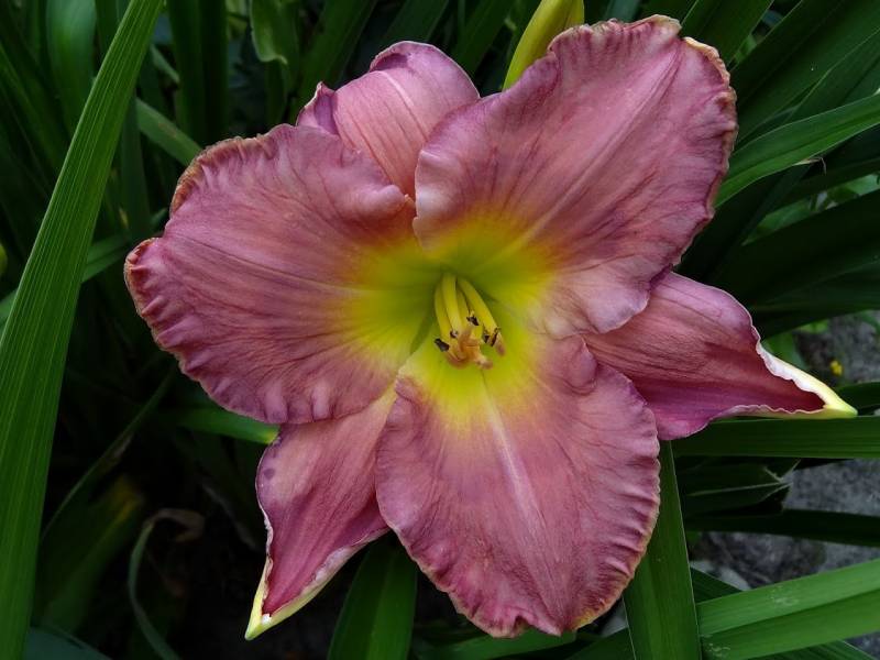 kwiat 14 cm, burgundowo fiopletowy z burgundowym okiem, złotym brzegiem i zieloną gardzielą, może powtarzać kwitnienie