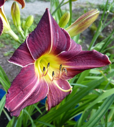 kwiat 12 cm, ciemno czerwony z filetowym cieniem i ciemniejszymi żyłkami z białą lamówką i zieloną gardzielą, może powtarzać kwitnienie