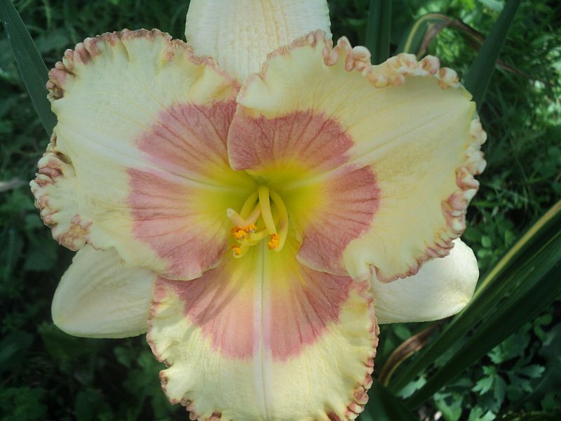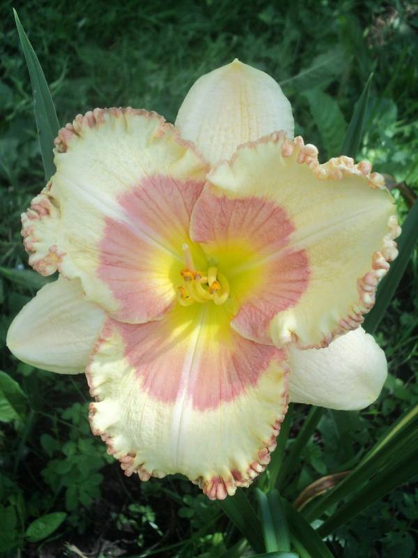 Hodowca: S. Achramowicz, 2014 Wysokość: ok 75 cm Kwiaty: kwiaty kremoworóżowe z jasnoróżowym okiem , płatki wykończone falbanką w kolorze oka , gardło kremowozielone. Wielkość kwiatu ok 14 cm. Stanowisko: słoneczne do półcienistego. Mrozoodporność: zimuje bez okrycia. Uwagi : 4 rozgałęzienia i do 23 pąków - u mnie pierwszy rok , więc ta informacja będzie do weryfikacji