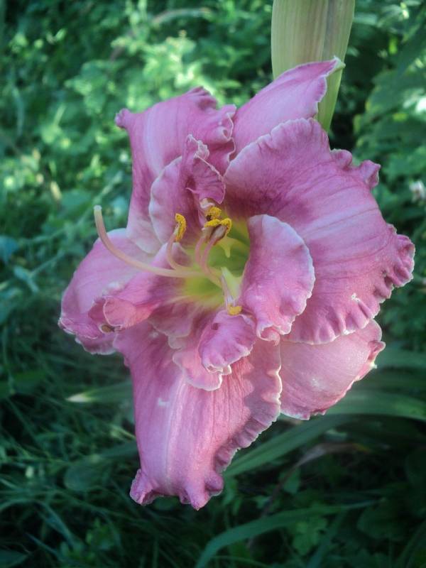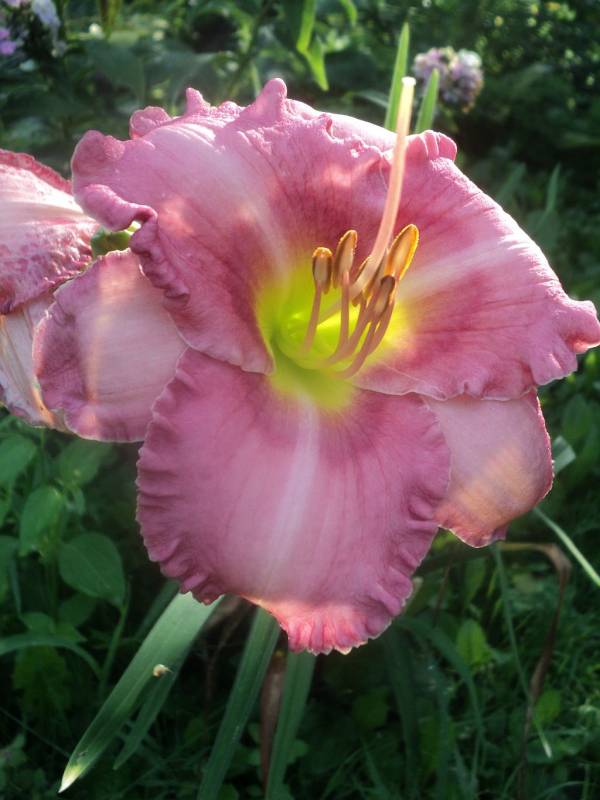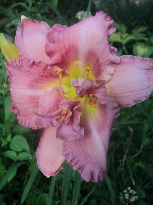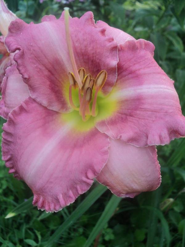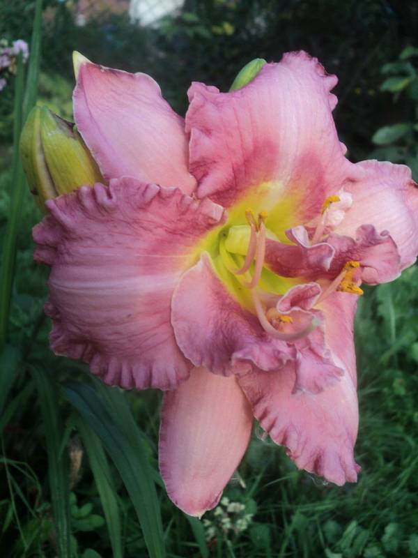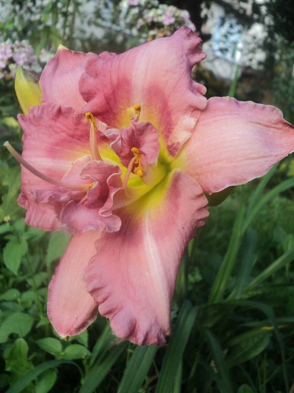 Hodowca: S. Achramowicz, 2017 Wysokość: ok 110 cm Kwiaty: kwiaty koloru pastelowo różowego z odcieniem czerwieni z wąskim o odcień ciemniejszym , rozmytym okiem , płatki wykończone falbanką , gardło kremowozielone. Wielkość kwiatu ok 14 cm. Stanowisko: słoneczne do półcienistego. Mrozoodporność: zimuje bez okrycia. Uwagi : z informacji hodowcy wytwarza 3 – 4 groniastych rozgałęzień i około 30 pąków - u mnie pierwszy rok , więc ta informacja będzie do weryfikacji . To jego pierwsze kwitnienie , zdarzały się kwiaty półpełne , zobaczymy jak będzie zachowywał się w nastepnych sezonach. Zakwitł pod koniec sezonu . Kwiaty pachną.