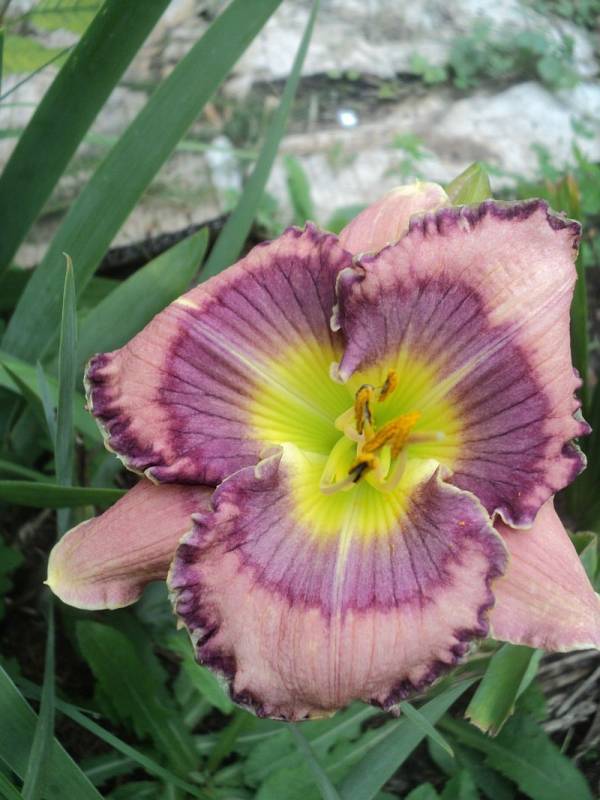 Hodowca: J.Bodalski 2016 Wysokość: ok 75 cm Kwiaty:Kwiaty jasno różowe z niebiesko lawendowym okiem i dwubarwną biało- lawendową falbanką , gardło zielono-żółte . Wielkość kwiatu ok 14 cm. Stanowisko: słoneczne do półcienistego. Mrozoodporność: zimuje bez okrycia. Uwagi : 2 rozgałęzienia,14 pąków na pędzie , w/g informacji hodowcy powtarza kwitnienie .